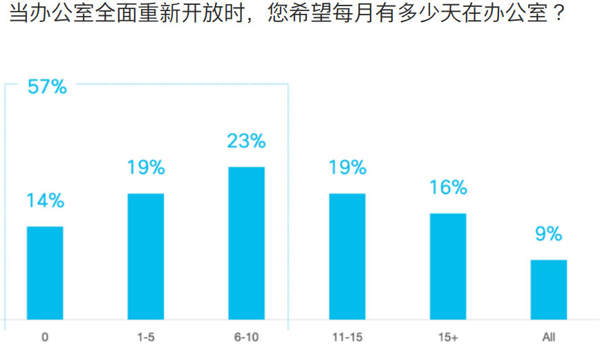 有 57% 的员工都表示每个月希望呆在办公室的时间不超过 10 天。